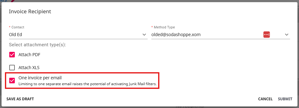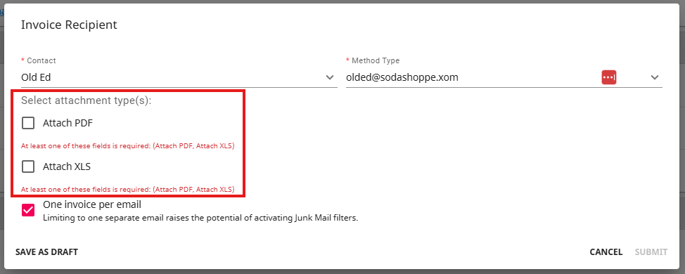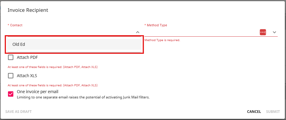*Note* When a method is selected that includes emailing the invoice, users will be prompted and required to add an invoice recipient. This can be added to the 'Invoice Recipients' card. Once one is added you may change the invoice method to one that includes email.
