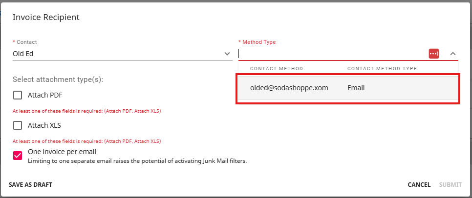 Once selected, decide which email address the invoice will be sent to in the "Method Type" drop-down: