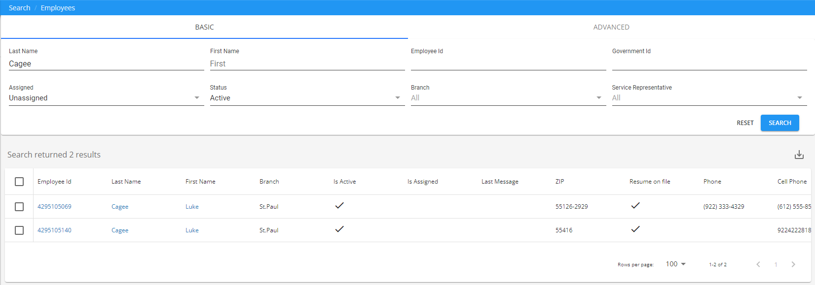 After the search has returned results, select one of the employees from the list: