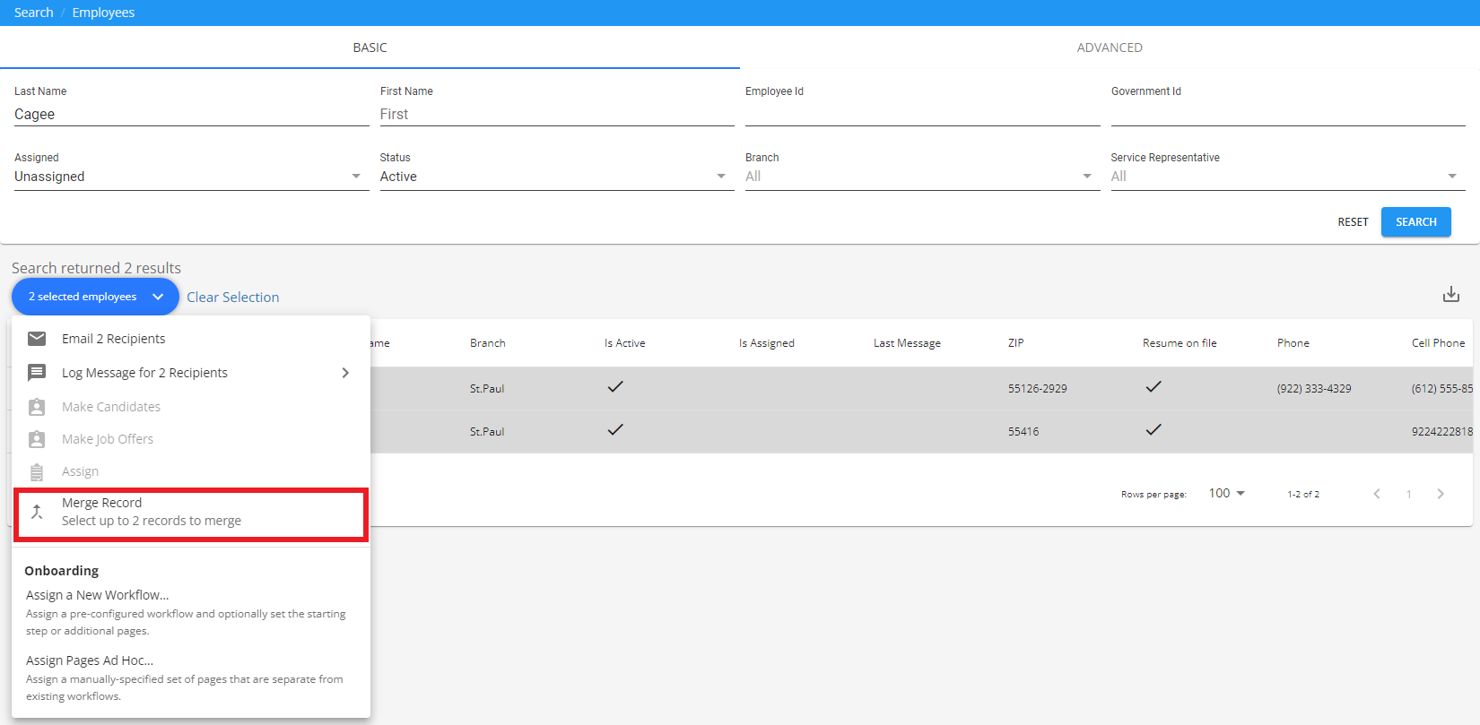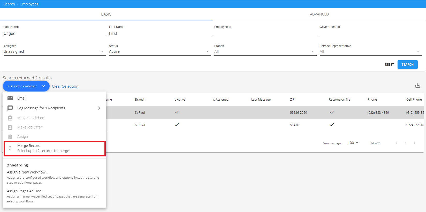 Additionally, you have the option of selecting up to 2 employee records within the search results to merge.
