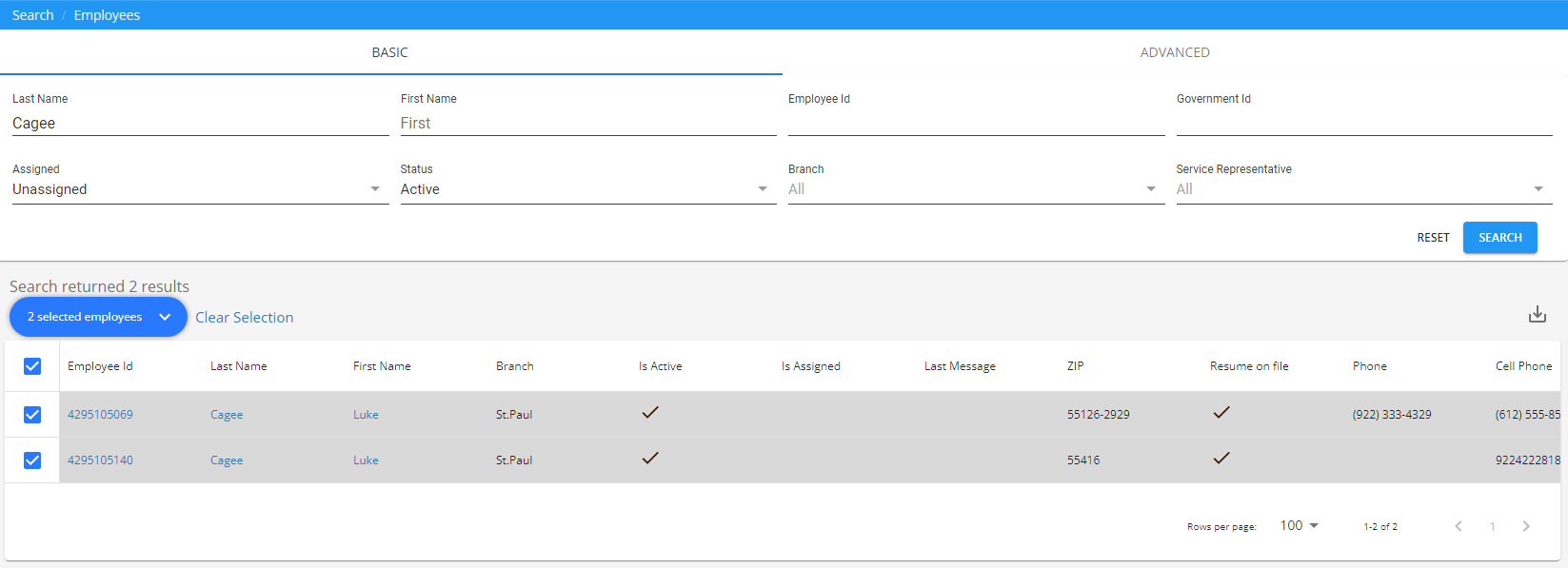 After the search has returned results, select two of the employees from the list: