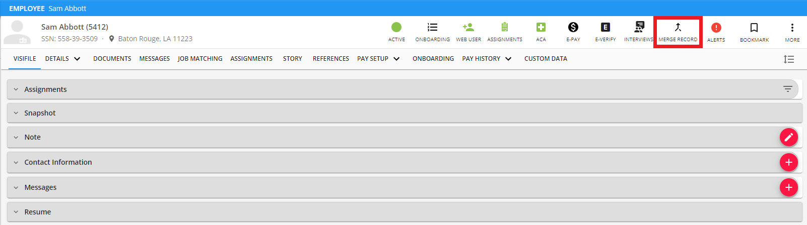 Begin by navigating to the employee record that you would like to be merged.