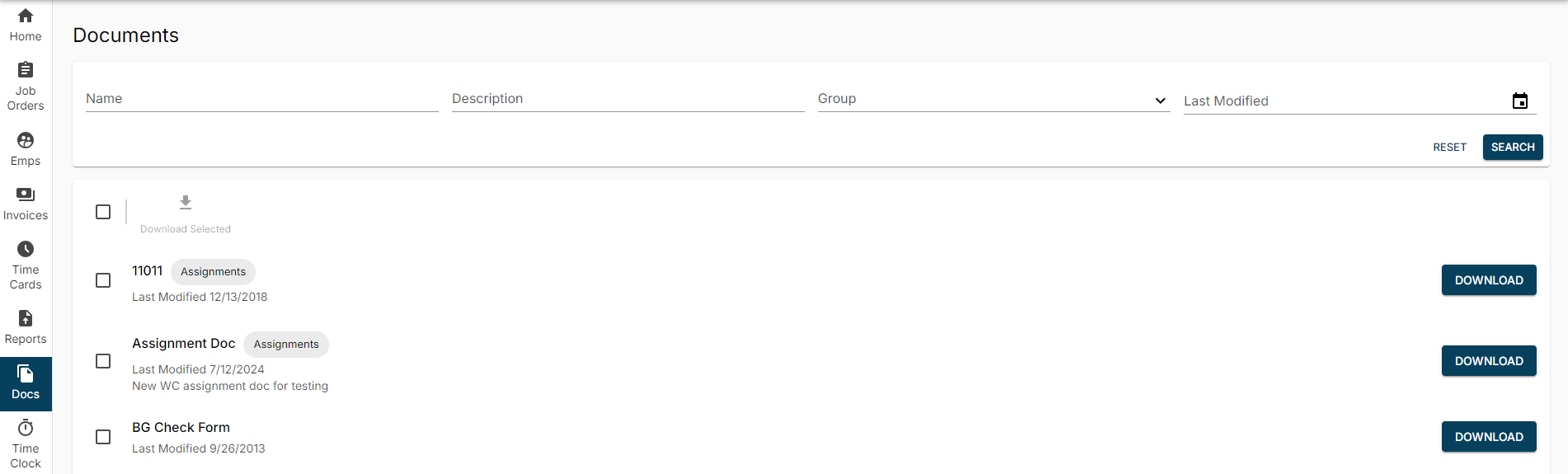 - Review assignments, timecards, skills, contact information, and required documents
