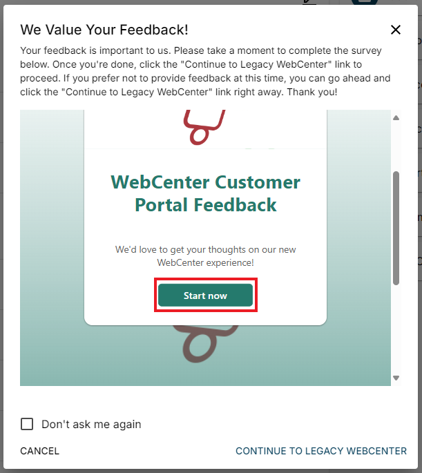 Upon selecting the "Back to Legacy WebCenter" option, a new window will open with a link to a survey that is used to gather your feedback on the updated Customer Portal. Please select the "Start now" button to begin the survey: