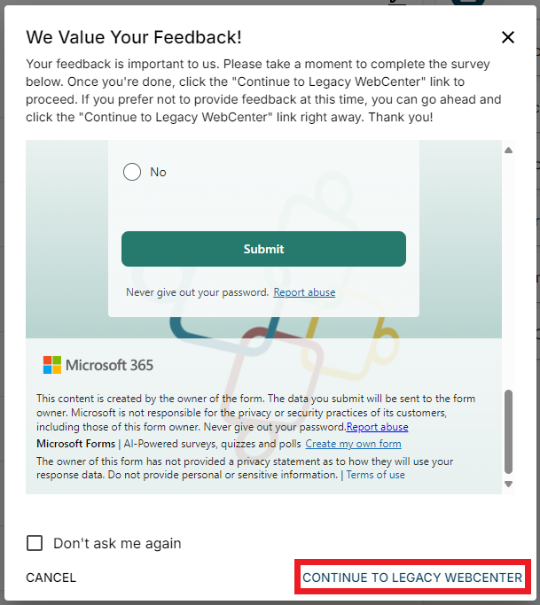 Once the survey is complete, select "Continue to Legacy WebCenter" to be navigated back to the Legacy WebCenter Customer Portal: