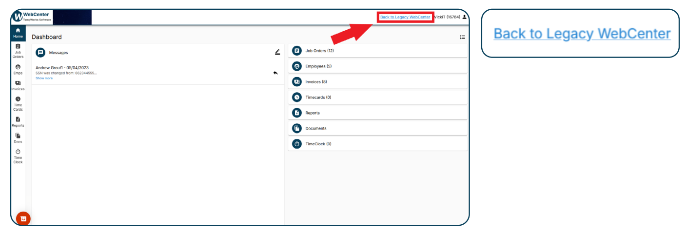 *Note* The updated WebCenter Customer Portal contains all the functionality as Legacy WebCenter, but in the event you need to navigate back to Legacy, you can select the "Back to Legacy WebCenter" option to the top right of the WebCenter window: