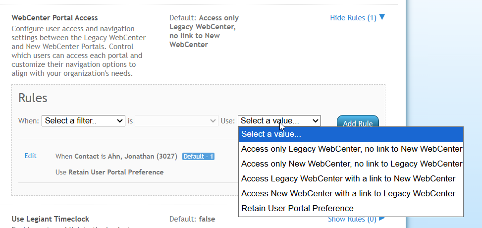 - Retain User Portal Preference: Users will stay in the portal from their previous session. For example, if a user was in the New WebCenter, they will remain there unless they switch to Legacy, and vice versa.