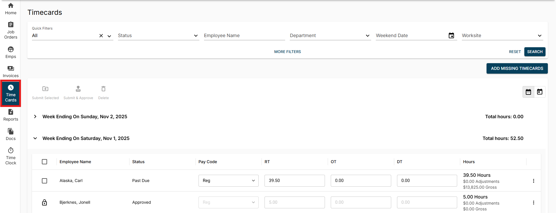 - All - Allows you to see all timecards in all statuses, this is also where you can edit timecards.