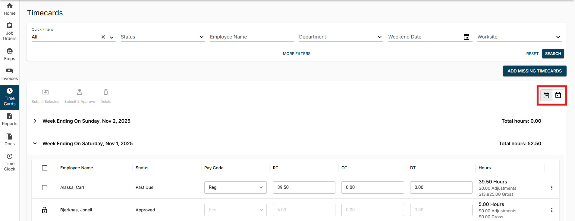 You can choose to see different sets of timecards via the Quick Filters at the top of the page: