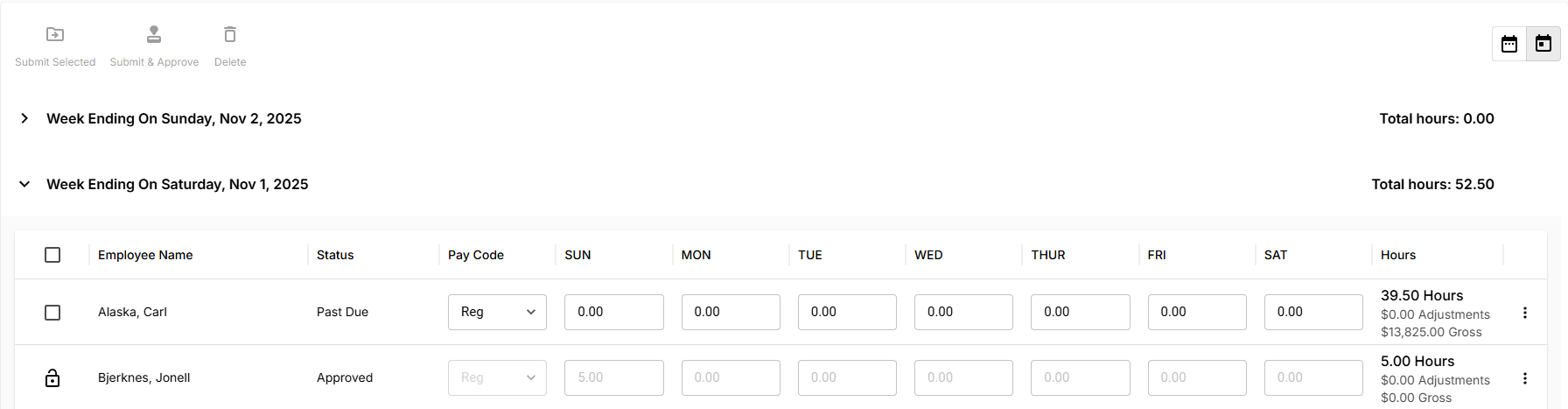 - Review - Allows you to see all submitted timecards looking for approval. Timecards can be approved or rejected from this view.