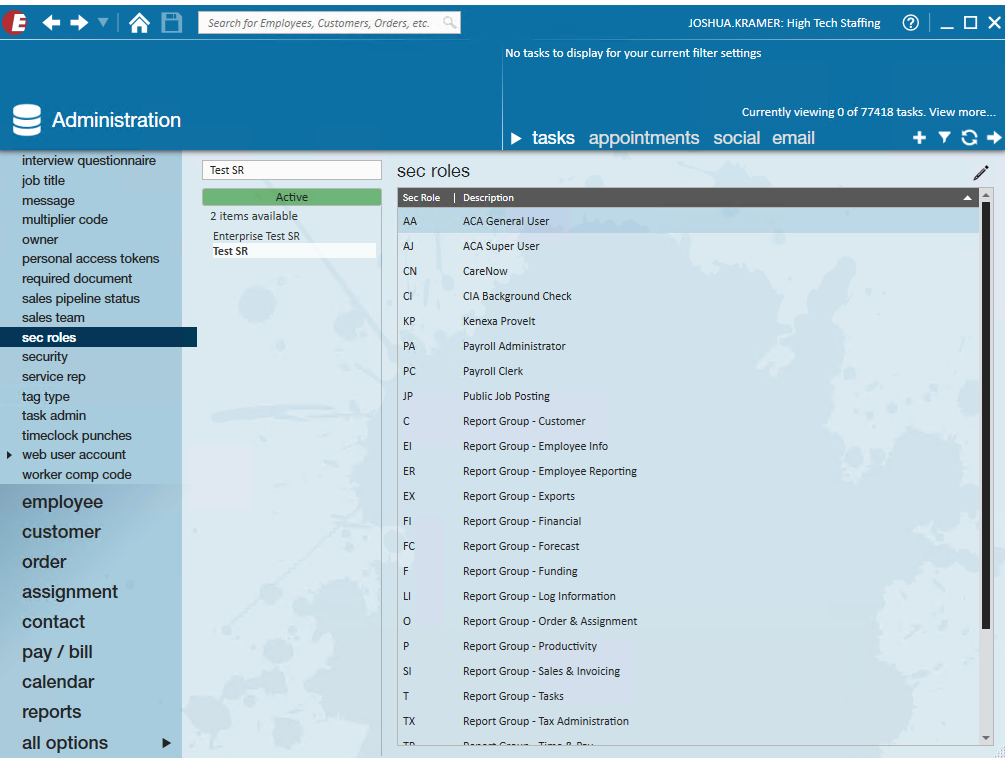 Navigate to Enterprise > All Options > Administration > Sec Roles: