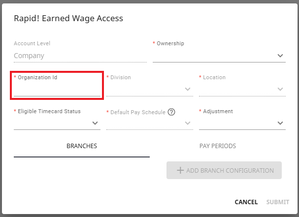 Within the Rapid! Earned Wage Access window, enter the "Organization ID" that has been provided to you by Rapid!: