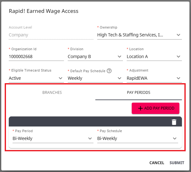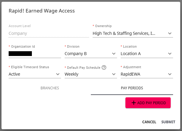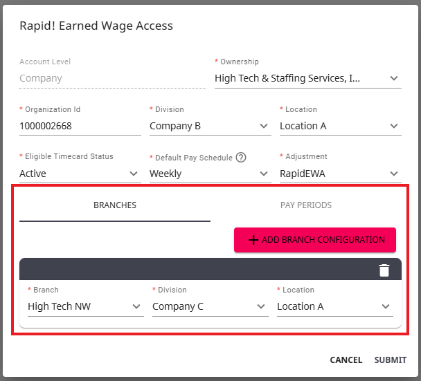 *Note* Optionally, you can choose to add branch configurations and/or additional pay periods by selecting the appropriate tab/option at the bottom of the Rapid! Earned Wage Access window: