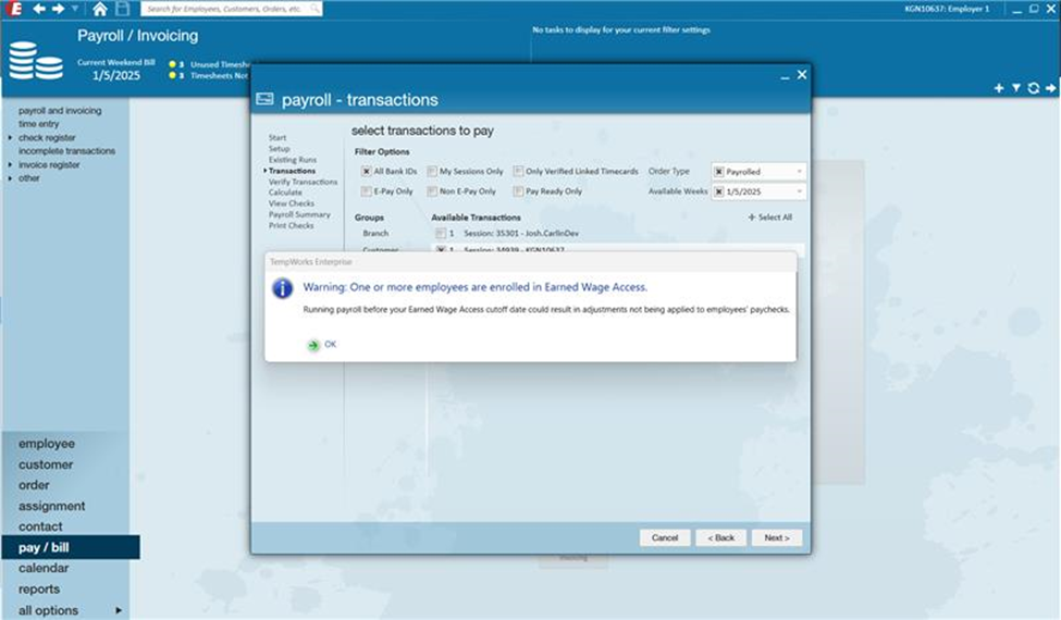 *Note* When creating the transactions during payroll, you may receive the following warning: