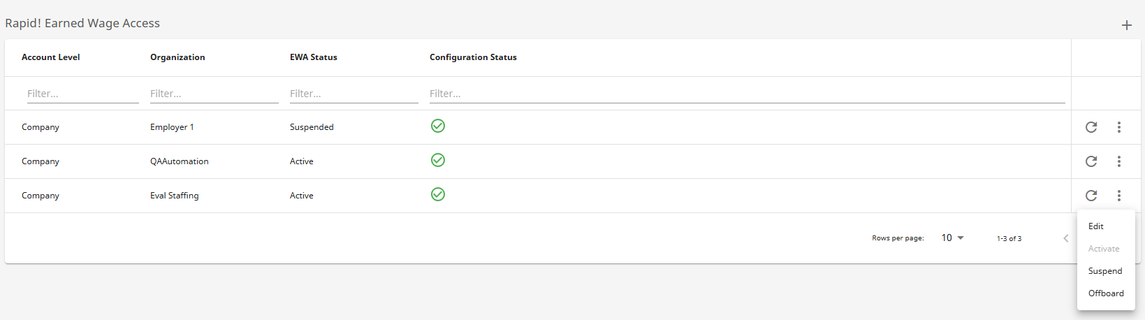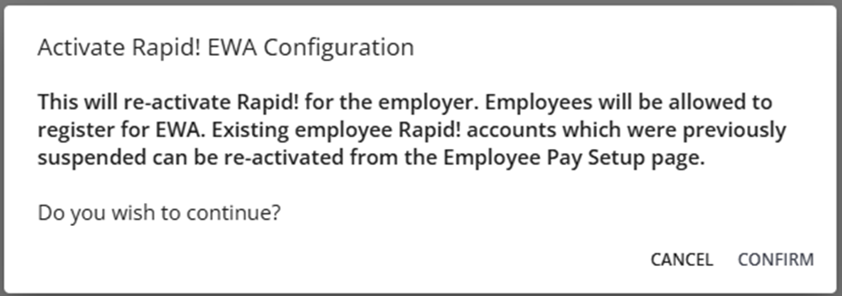 - Activate: If previously suspended, you can re-activate the employer account with Rapid! EWA. Previously suspended employees will need to be manually re-activated to gain access to Rapid! EWA.