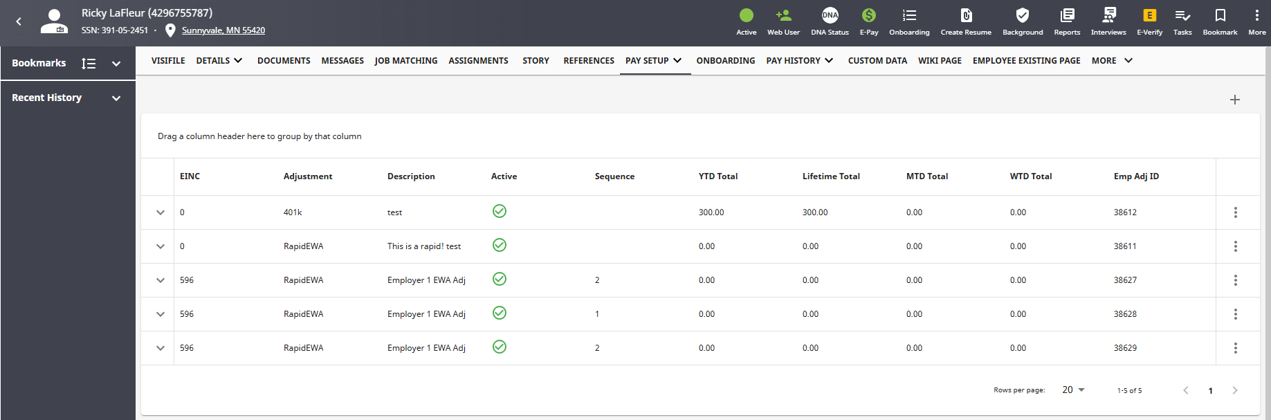 *Note* Every time an employee utilizes EWA, a new adjustment file is sent from Rapid! during that pay period. Therefore, new adjustments are applied to the employee record and previously paid adjustments are marked as "inactive".