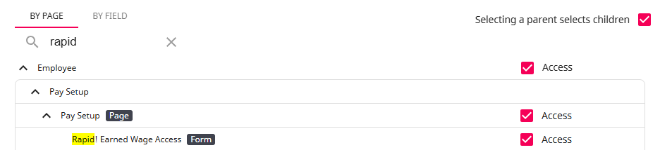 *Note* If you utilize custom Security Groups with Advanced Permissions, you will need to add the Access to the "Rapid! Earned Wage Access" form within Employee > Pay Setup to the Security Groups that require the functionality: