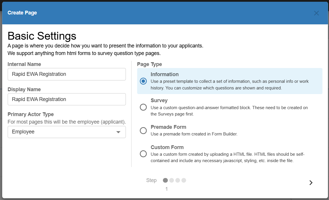 Within the "Create Page" window, under "Basic Settings", enter/select the following: