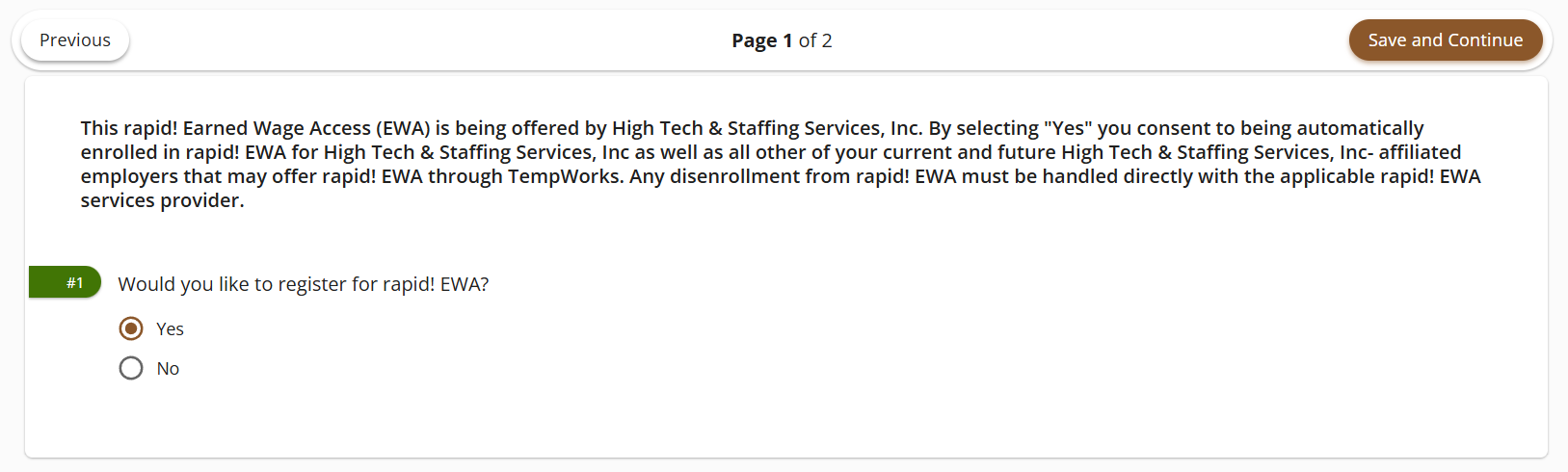 The employee will select "Yes" to confirm they would like to register with Rapid! EWA and then select "Save and Continue":