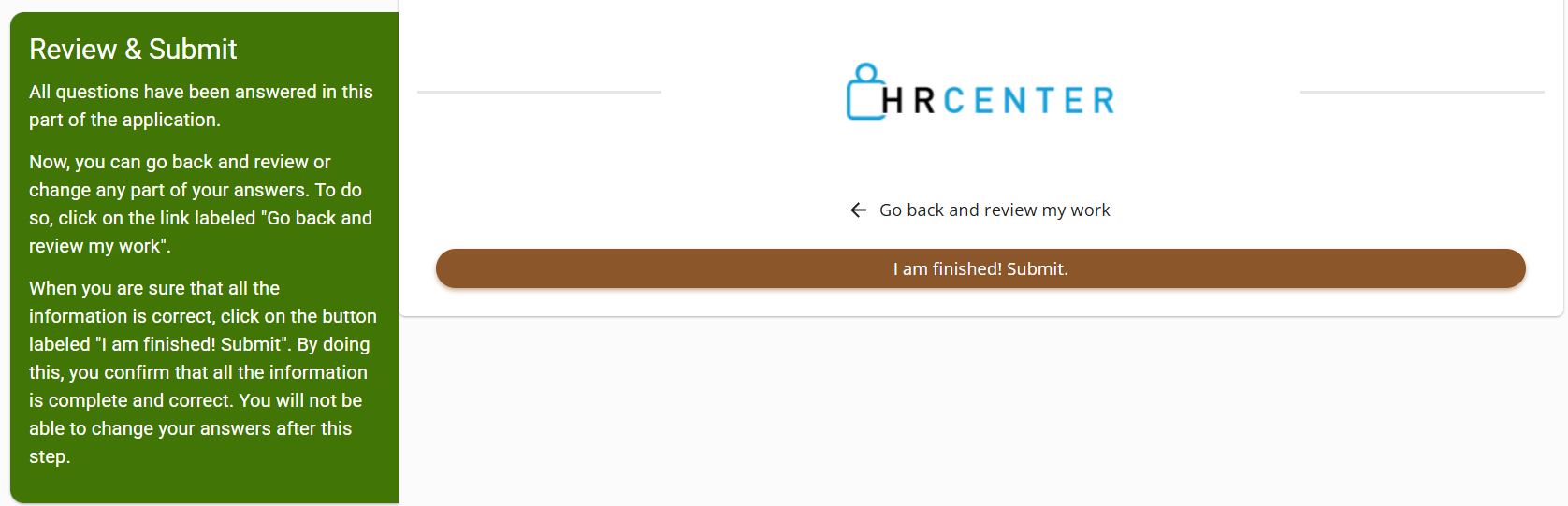 The employee will select "I am finished! Submit." to complete the HRCenter workflow: