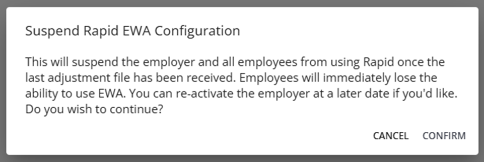 - If suspended, all employees will immediately lose the ability to use Rapid! EWA.