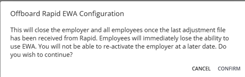 - Offboard: If previously active or suspended, you can close the employer account from Rapid! EWA. This will also immediately cause all employees to lose access to Rapid! EWA.